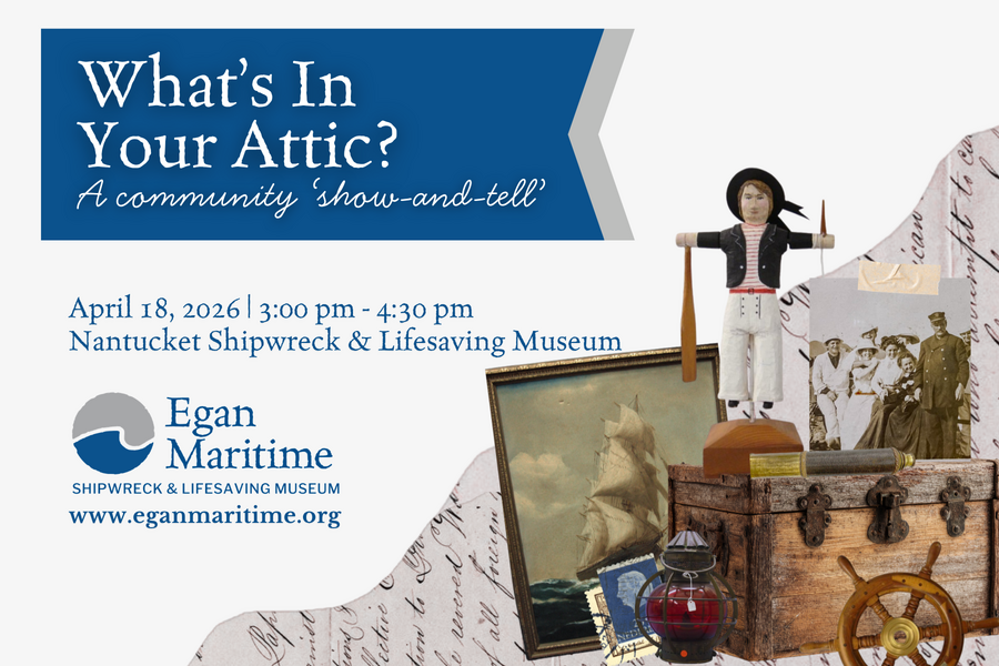 We’re inviting members of the community to showcase personal items connected to Nantucket’s maritime or general history. Selected local presenters* will bring an item to the museum and join Egan Maritime staff in a lively gam exploring its personal significance, historical context, and the stories it may hold. Plus, get an exclusive look at artifacts from the Shipwreck & Lifesaving Museum’s ‘attic’ (archival storage) that aren’t typically on display.