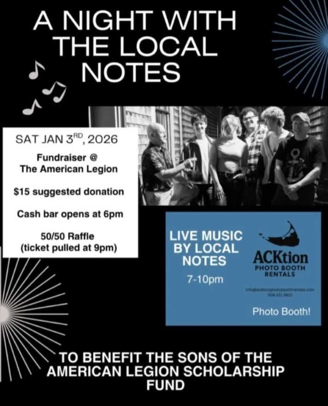 Home Events - Nantucket Events Community Music A Night with the Local Notes A Night with the Local Notes 00 days 00 hours 00 minutes 00 seconds Date Jan 03 2026 Time 7:00 pm - 10:00 pm Cost $15.00 Location American Legion 21 Washington Street Category CommunityMusic Share this event