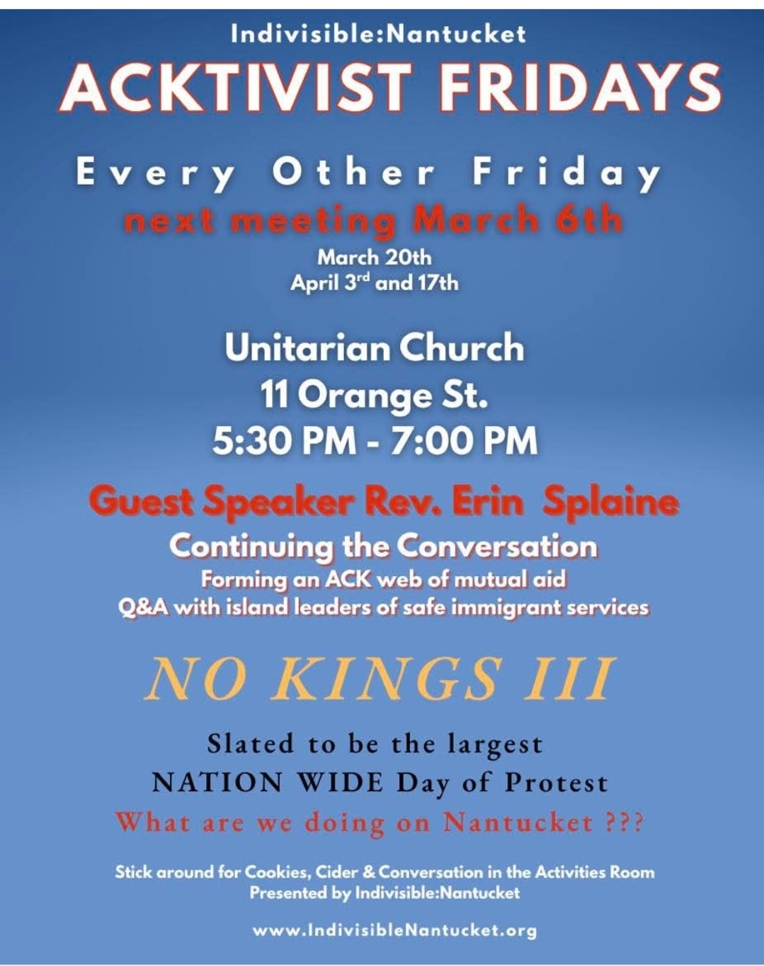 Home Events - Nantucket Events Community Acktivist Fridays Acktivist Fridays Continuing the Conversation, Forming an ACK web of mutual aid Q&A with island leaders of safe immigrant services 00 days 00 hours 00 minutes 00 seconds Date Mar 20 2026 Time 5:30 pm - 7:00 pm More Info Read More Location Unitarian Universalist Church 11 Orange St Category Community Read More Next Occurrences Apr 03 2026 5:30 pm - 7:00 pm Apr 17 2026 5:30 pm - 7:00 pm Share this event