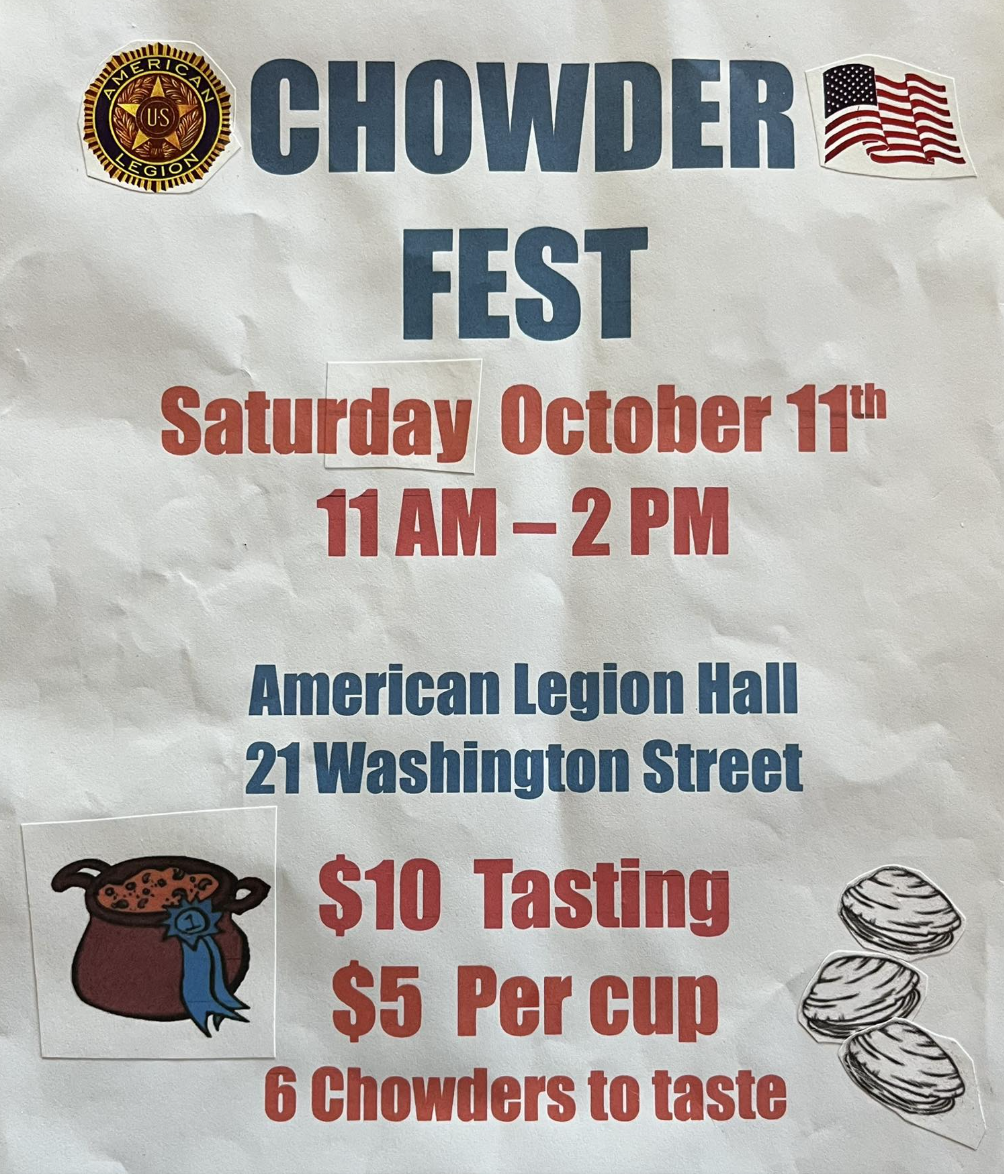 Home Events - Nantucket Events Charity Community Culinary Chowder Fest Chowder Fest 00 days 00 hours 00 minutes 00 seconds Date Oct 11 2025 Time 11:00 am - 2:00 pm Location American Legion 21 Washington Street Category CharityCommunityCulinary Share this event