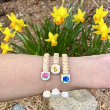 Students can choose from a yellow daffodil or a blue or pink hydrangea on their endcap. This 1/4″ cuff is the perfect addition to your jewelry collection.