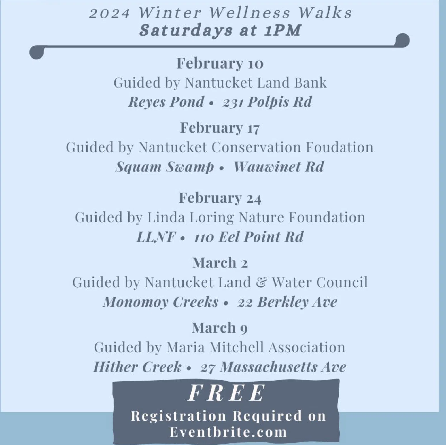 Reserve a spot at https://www.eventbrite.com/e/winter-wellness-walks-with-the-nantucket-conservation-foundation-tickets-814217094247?aff=odcleoeventsincollection