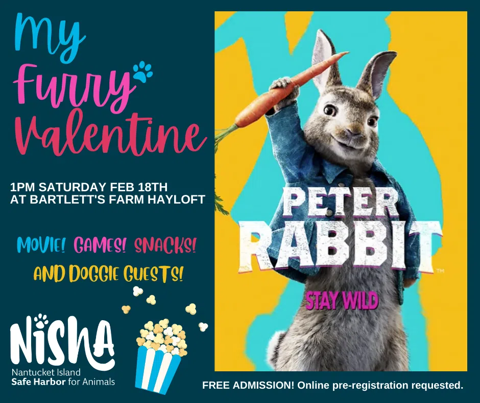 Bring your kids to the Hayloft at Bartlett’s Farm to watch the movie Peter Rabbit, enjoy snacks, games, and some animal visitors. Presented by NiSHA: Nantucket Island Safe Harbor for Animals. Free admission, but pre-registration is required at https://bartlettsfarm.com/event/my-furry-valentine-2/