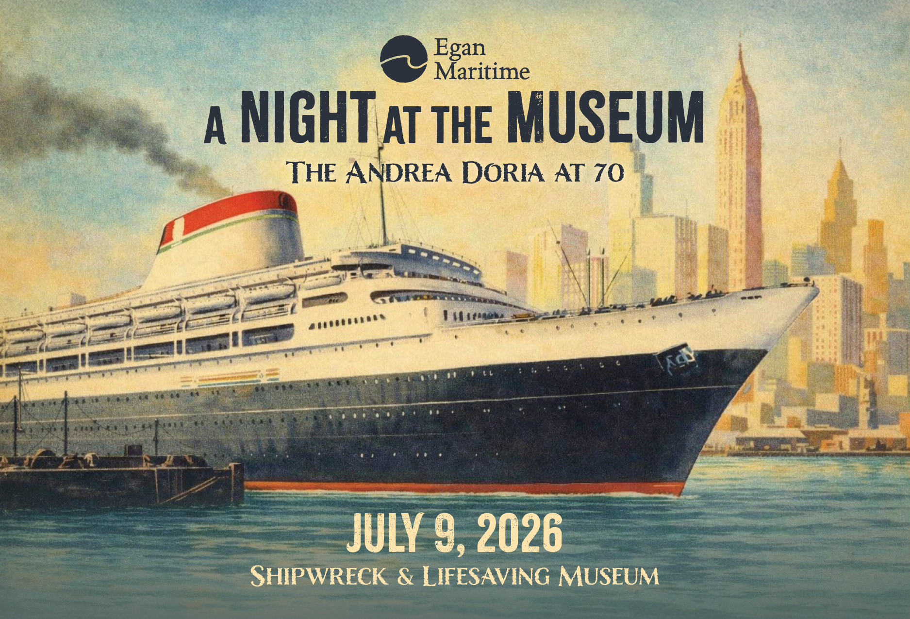 Join Egan Maritime Institute for an unforgettable evening marking the 70th anniversary of the sinking of the Andrea Doria, one of the 20th century’s most storied ocean liners.