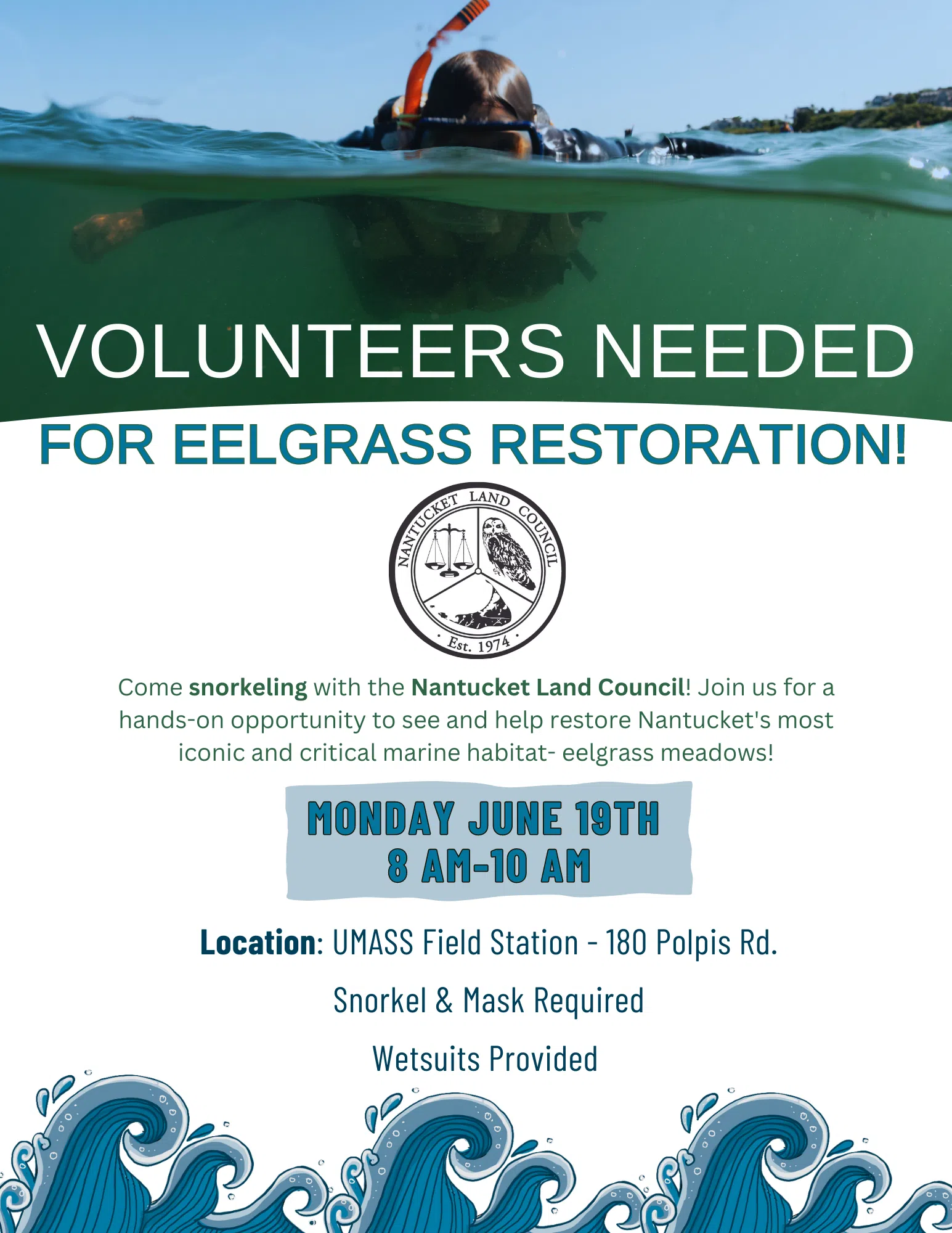Join us on Monday, June 19th, at 180 Polpis Road (UMASS Field Station) for a hands-on opportunity to see and help restore Nantucket’s iconic and critical marine habitat- eelgrass meadows! The eelgrass plants are flowering and producing seeds this time of year, so we’ll be snorkeling during low tide to collect seeds for our restoration site north of Bass Point.